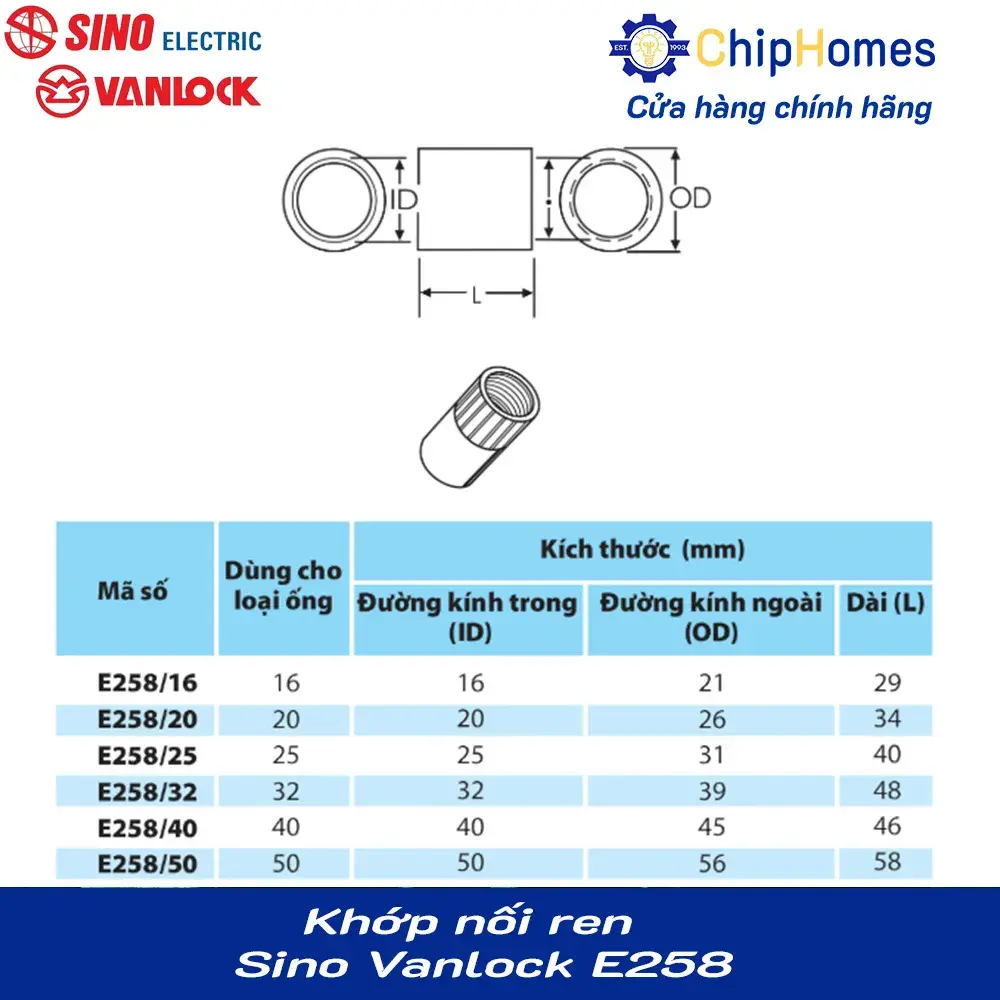 - Khớp nối ren 20mm (E258/20) – dùng để liên kết đầu ống ren với ống trơn, đảm bảo đường ống kín khít và chắc chắn.
