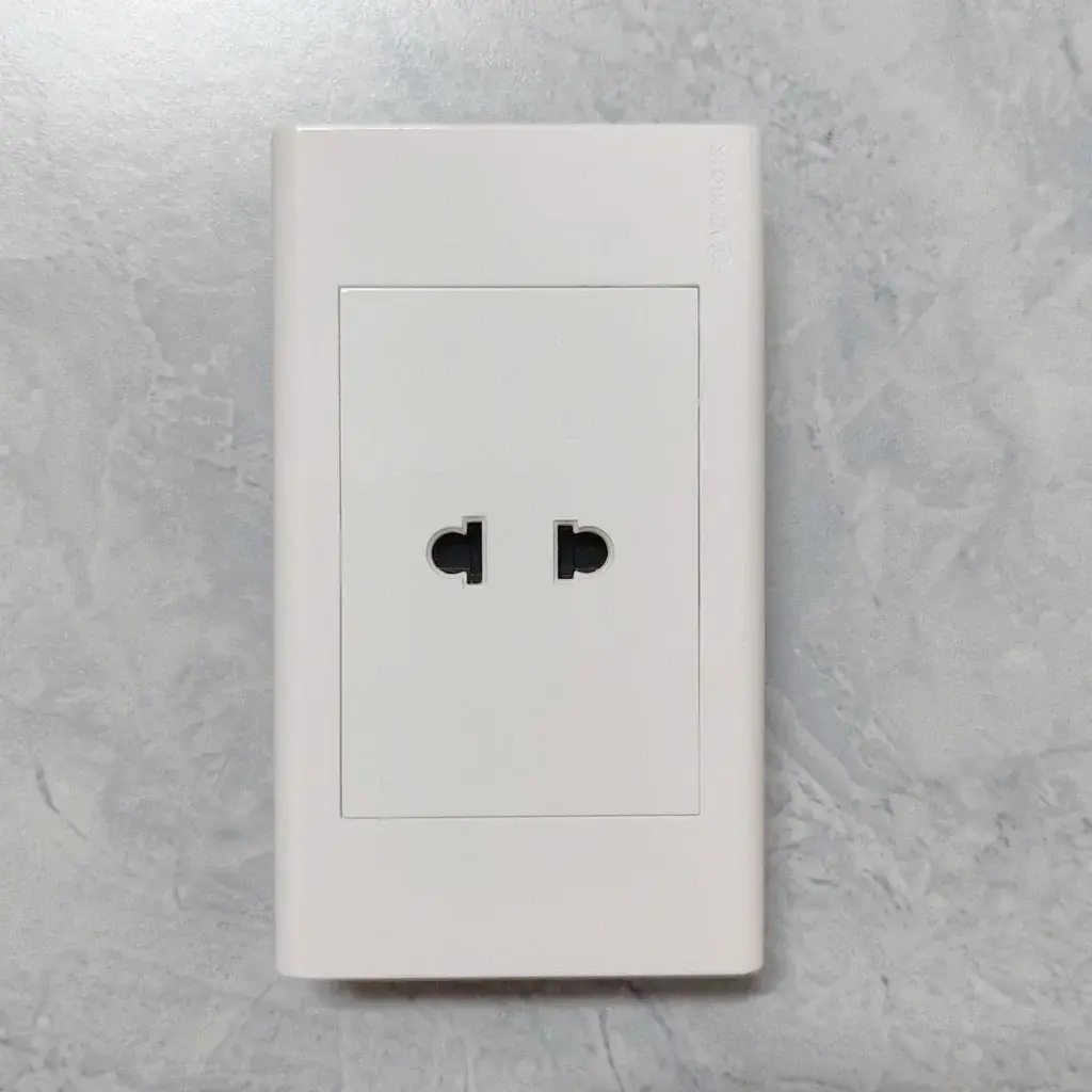 - Chức năng: Ổ cắm 2 chấu đơn, có màn che